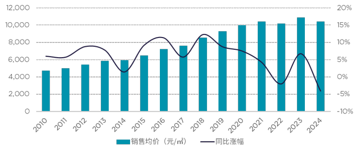 (全国新建商品住宅销售面积走势变化) 四季度新房销售均价10419元/平方米 2024年,全国住宅新房销售均价为10419元/平方米,同比下降4.1%。9月末中央政治局提出“促进房地产市场止跌回稳”为楼市注入信心,同时各类限制性政策的解除激发了以提升居住品质为代表的改善型需求的活力,四季度伴随成交量的回暖,整体价格亦较前三季度有所上升,全年均价较1-9月上涨了1.7%。