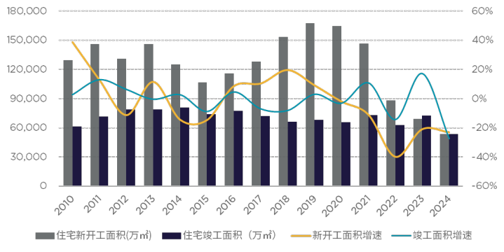 (全国住宅新房销售均价走势变化) 截至2024年年末,全国住宅待售面积为39088万平方米,较三季度末增加了1409万平方米。在四季度新房市场成交回暖的积极带动下,供应及成交双双放量,全国住宅库存量小幅上升。从政策对市场的引导角度来看,首付比例和贷款利率的下降吸引刚需入市,同时放开改善型需求的入市限制,二者共同推动局部市场呈现回稳迹象。连续3年住宅开发投资额下行将影响未来供应量,市场回暖迹象或令新房成交量上行成为可能,同时再加上专项债对存量住房的消化,都将有望带动未来库存量的逐步下降。
